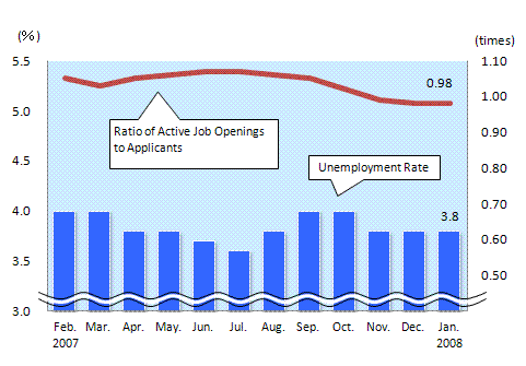 The unemployment rate (seasonally adjusted) was 3.8%, unchanged from the previous month. That for men was 3.9%, increased by 0.1 points from the previous month, and that for women was 3.7%, unchanged from the previous month.