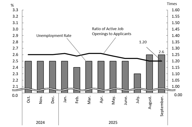 The unemployment rate (seasonally adjusted) was 2.6%, unchanged from the previous month. That for men was 2.7%, decreased by 0.1 point from the previous month and that for women was 2.4%, increased by 0.1 point from the previous month.