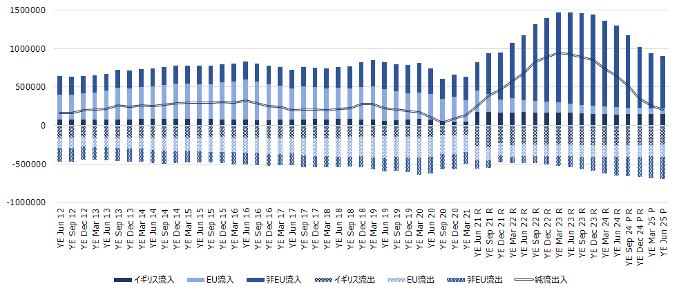 統計局が11月に公表した外国人等の流出入データによれば、流入者数から流出者数を除いた純流入数は、2025年6月までの12カ月間に20万4000人(流入者数89万8000人、流出者数69万3000人)で、前年(64万9000人)から約7割減少した。EU離脱以降、EU域外からの外国人の流入拡大が続いていたが、2023年3月の純流入数94万4000人をピークに、流入者数の急速な減少と流出者数の増加が並行して生じている。全体の純流入数は、EU離脱前の平均的な水準に戻ったものの、EU出身者は2022年半ば以降、流出が流入を上回って推移しており、非EU出身者のみが増加している。