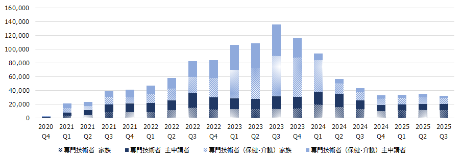 図表3:専門技術者、専門技術者(保健・介護)の主申請者・家族向け入国許可の推移