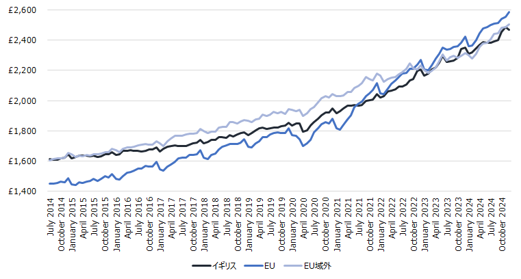出身別労働者の相対的な賃金水準にも変化が見られる(図表5)。イギリス人労働者は従来、EU労働者に比して高い賃金水準にあったが、EU離脱に伴う制度変更が行われた2021年を挟んで、この関係が逆転しており、これには上述の低賃金業種におけるEU労働者の減少も一因となっていることが推測される。一方、非EU労働者については2015年以降、イギリス人労働者より高い賃金水準で推移してきたが(注4)、EU離脱に伴う制度変更(受け入れ可能な職種レベル・給与水準の引き下げ等)を経て、2022年末にはほぼ同水準となっている。
