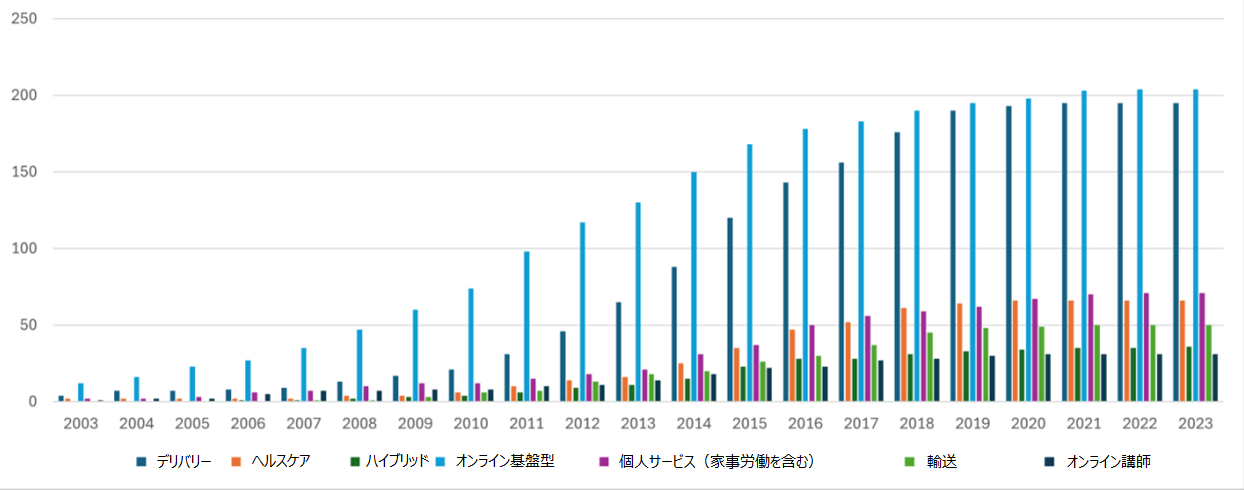 プラットフォームの種類別にみると、労働者がオンラインでサービスを提供するオンライン基盤型が204件で最も多い。この中には、フリーランス(136件)、マイクロタスク(42件)、競技プログラミング(25件)のプラットフォームが含まれる。次に多いのはデリバリーであり、195件である。続いて、個人サービスが71件、ヘルスケアが66件、タクシーが50件、オンライン講師が31件の順である。さらに、複数のサービスを提供するハイブリッドプラットフォームが35件存在する。