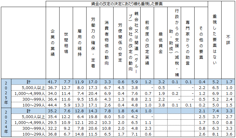 図表:賃金の改定の決定にあたり最も重視した要素別企業割合(2025年、2024年)(単位:%)
