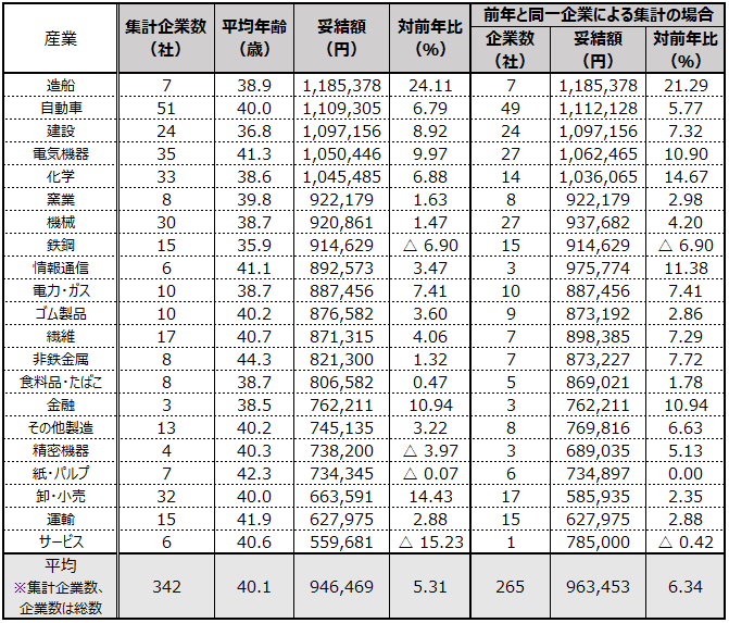 産業別にみると、平均妥結額が最も高いのは「造船」で118万5,378円となっており、次いで「自動車」(110万9,305円)、「建設」(109万7,156円)、「電気機器」(105万446円)、「化学」(104万5,485円)、「窯業」(92万2,179円)、「機械」(92万861円)、「鉄鋼」(91万4,629円)、「情報通信」(89万2,573円)、「電力・ガス」(88万7,456円)、「ゴム製品」(87万6,582円)、「繊維」(87万1,315円)などの順となっている(図表)。