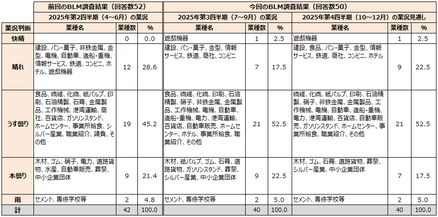 今回は2025年第3四半期(7~9月期)の業況実績と第4四半期(10~12月期)の業況見通しについて調査した。回答は企業と業界団体の計50組織、40業種から得た。