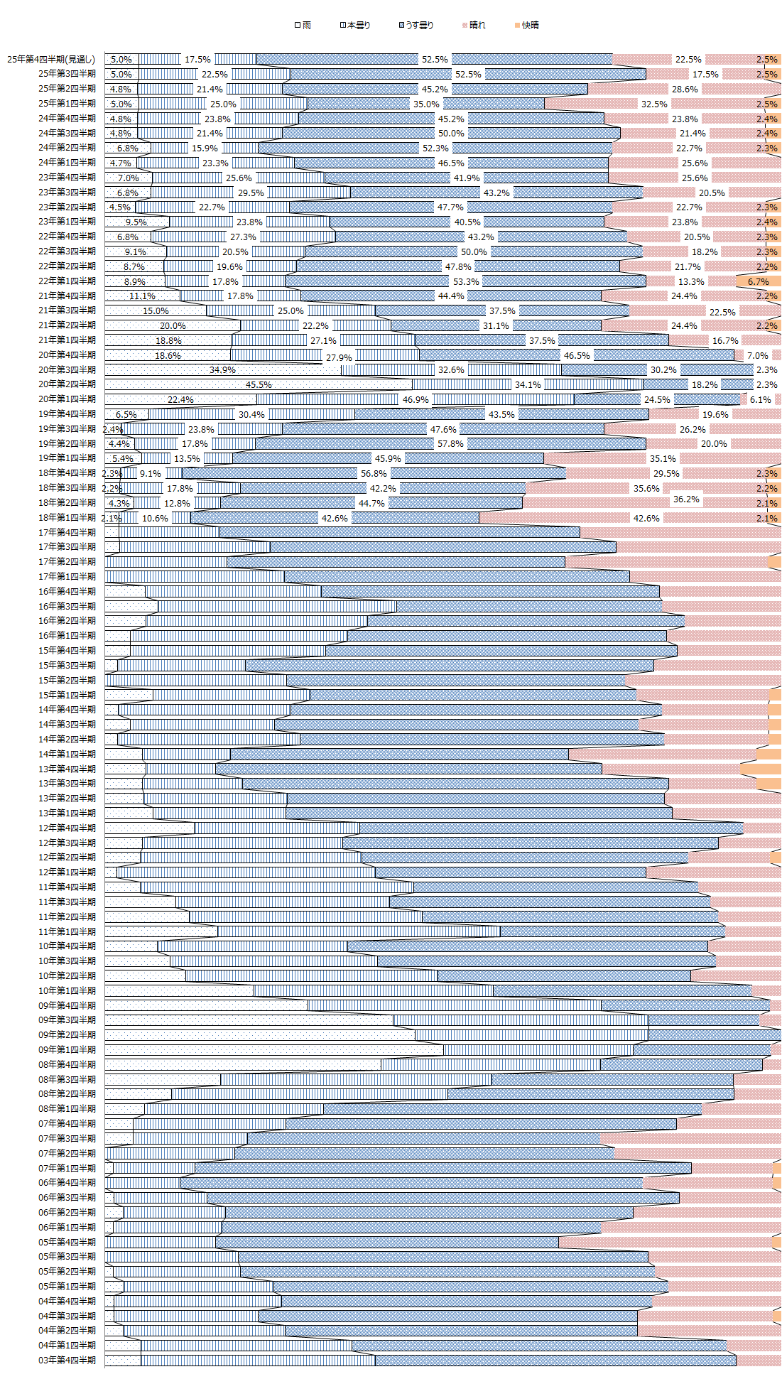 2025年第3四半期の業況実績は、回答があった40業種中、「快晴」が1(業種全体に占める割合は2.5%)、「晴れ」が7(同17.5%)、「うす曇り」が21(同52.5%)、「本曇り」が9(同22.5%)、「雨」が2(同5.0%)(表、図)。前回調査の2025年第1四半期と比べると、「快晴」と「晴れ」を合わせた割合が約9ポイント低下した。