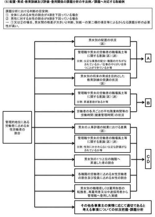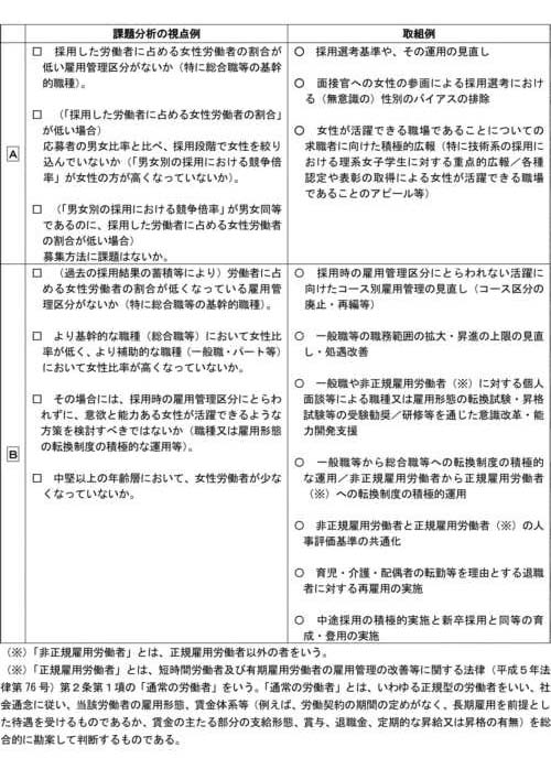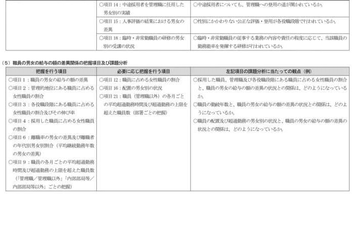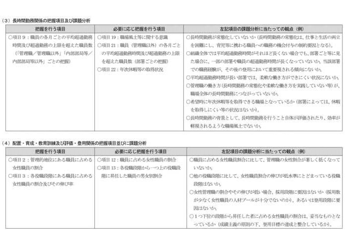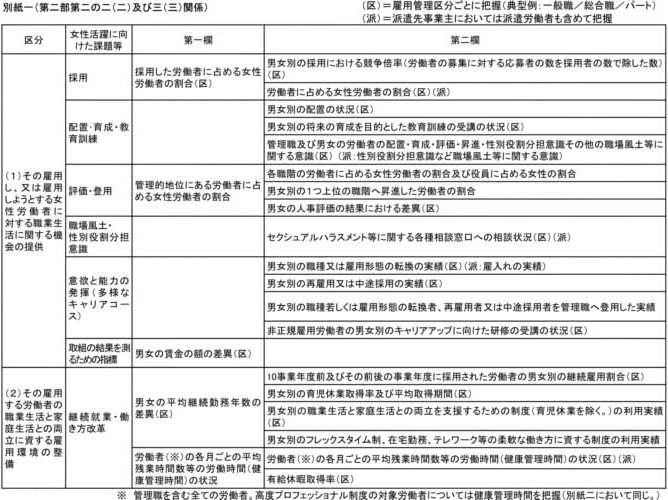 我が国の事業主においては、とりわけ、女性の採用者が少ないこと、第一子出産前後の女性の継続就業が困難であること、男女を問わない長時間労働の状況があり仕事と家庭の両立を妨げていること、女性の活躍度合いを測る重要な指標の一つである管理職に占める女性比率が低いこと等の課題を抱える場合が多い。このため、全ての事業主において、これらの課題の有無の指標となる別紙一の第一欄の項目について、状況把握を行い、課題分析を行うことが求められる。 |