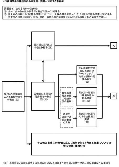状況把握・課題分析に当たっては、以下の方法によることに留意されたいが、各特定事業主の実情に応じて、他に適切な方法がある場合は、当該方法による把握・分析も効果的である。 |
