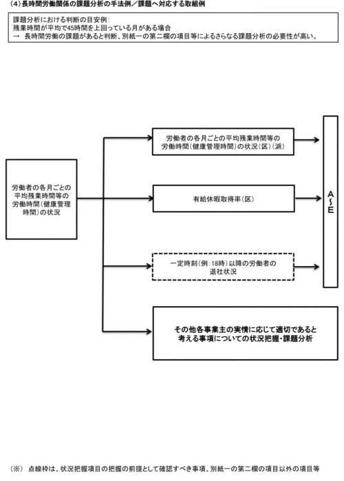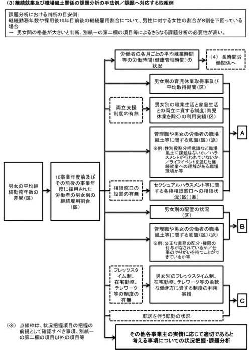 また、各事業主の実情に応じて、より深く課題分析を行うために他に適切な状況把握の項目や課題分析の方法がある場合は、当該項目の状況把握や当該方法による分析を行うことも効果的である。 |