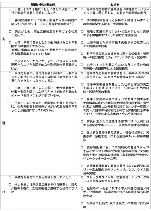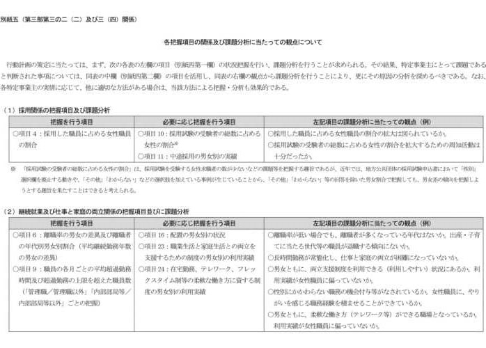 行動計画の策定に当たっては、まず、別紙四の第一欄の項目の状況把握を行い、課題分析を行うことが求められる。その結果、特定事業主にとって課題であると判断された事項については、別紙四の第二欄の項目を活用し、別紙五の観点も参考に、更にその原因の分析を深めるべきである。 |