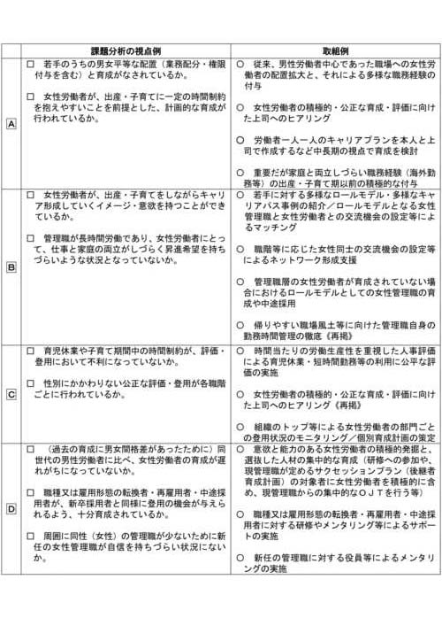 検討の際は、組織全体にわたって、性別にかかわりない公正な採用・配置・育成・評価・登用が行われるように徹底していくことが必要である。 |