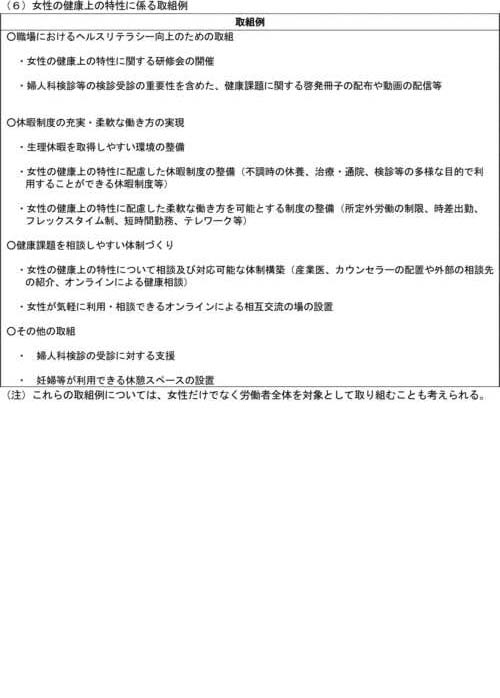 また、男女の性差を踏まえ、特に職場における女性の健康上の特性に係る取組が行われることが望ましい。一方、健康に関してはプライバシー保護が特に求められることも踏まえる必要があることに留意が必要である。なお、性別を問わず使いやすい特別休暇制度の整備及び職場全体の働き方改革等、女性だけでなく労働者全体を対象として取り組むことも有効である。 |