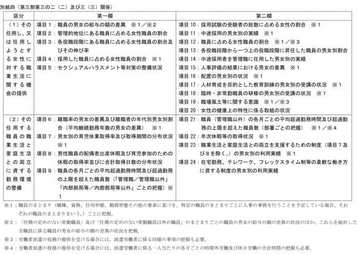 は、以下の事項について、内閣府男女共同参画局長、内閣官房内閣人事局人事政策統括官及び総務省自治行政局公務員部長の定める方法によって算出し、公表するものとする。また、各特定事業主の実情に応じて、更に詳細な区分により公表することも可能である。 |