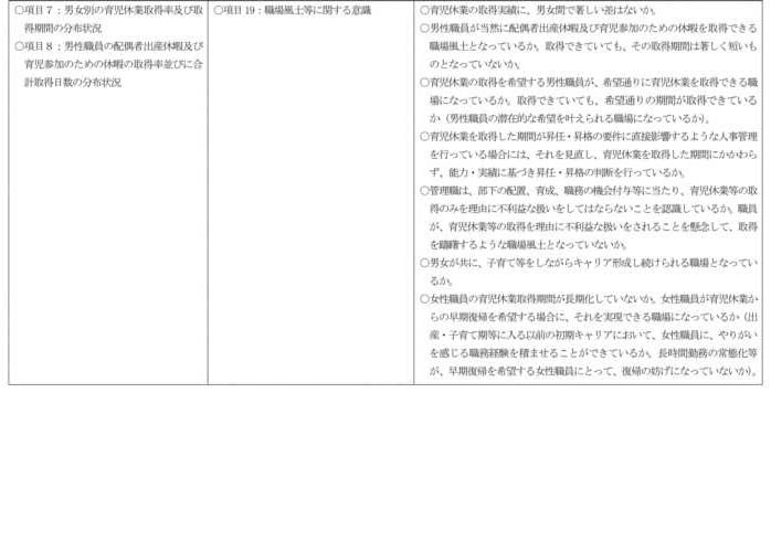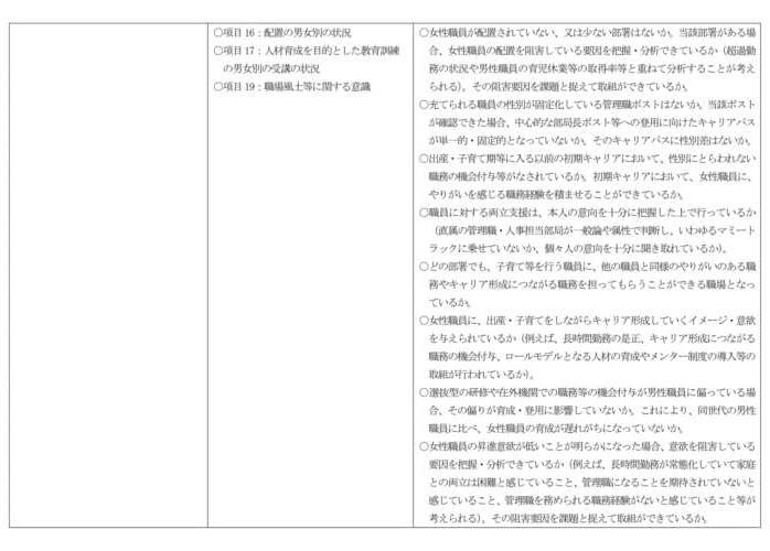 ・職員の配置の状況は、女性職員が配属されていない職場の有無等を把握し、さらに、当該職場の超過勤務の状況や男性の育児休業等の取得状況を重ねて職場の課題を分析すること。 |