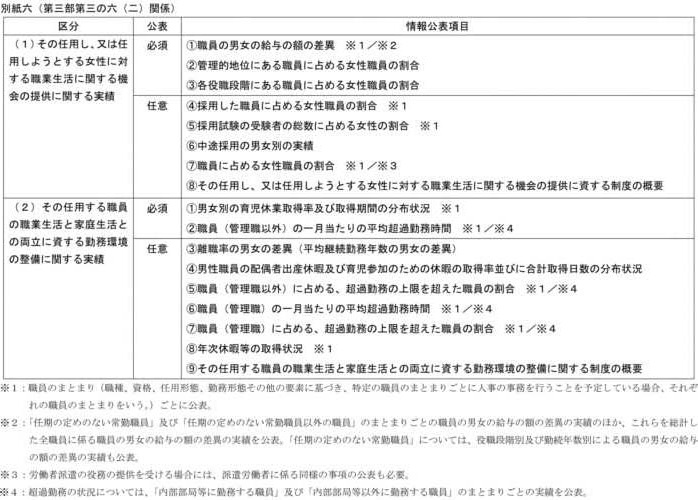 なお、別紙六の項目((1)⑦を除く。)については、必ずしも全ての項目を公表しなければならないものではないが、一般事業主に対し率先垂範すべき公務部門として積極的に公表することが望ましい。 |