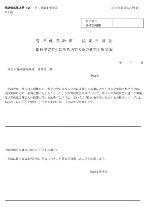 2 法第八条第一項、第八条の五第一項又は第八条の六第一項の認定の申請をする場合において、認定を受けようとする育成就労計画が監理型育成就労を行わせるものであるときは、当該申請をする者は、監理支援を受ける監理支援機関から法第八条第五項第一号(法第八条の五第三項及び第八条の六第三項において準用する場合を含む。)に規定する指導を受けたことについて、前項の申請書に当該監理支援機関の証明を受けなければならない。
