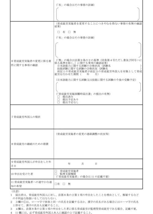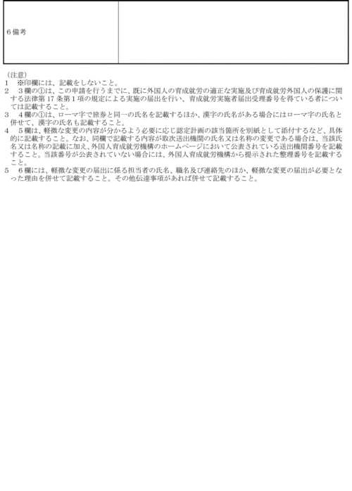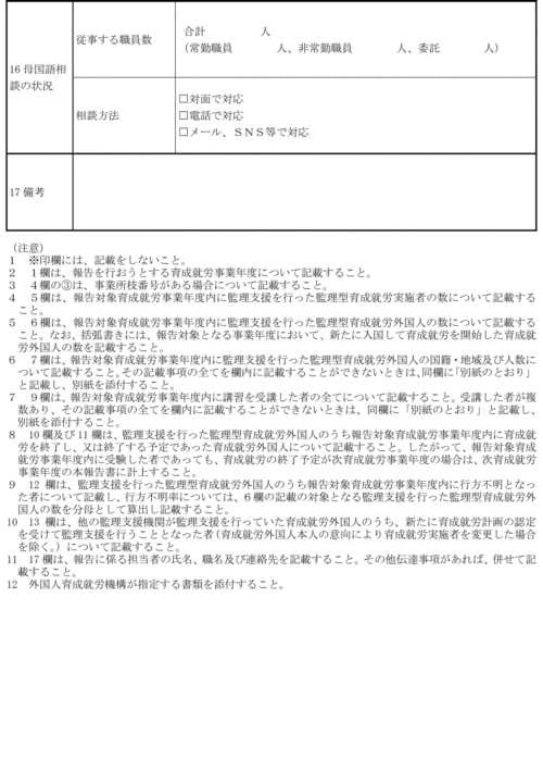 六 育成就労指導員(第十五条第一項第二号の規定により選任された育成就労指導員をいう。以下同じ。)及び生活相談員(同項第三号の規定により選任された生活相談員をいう。以下同じ。)の氏名及び役職名