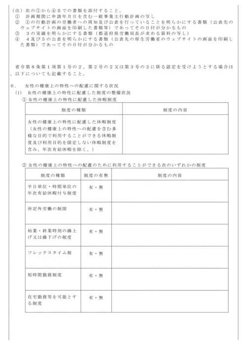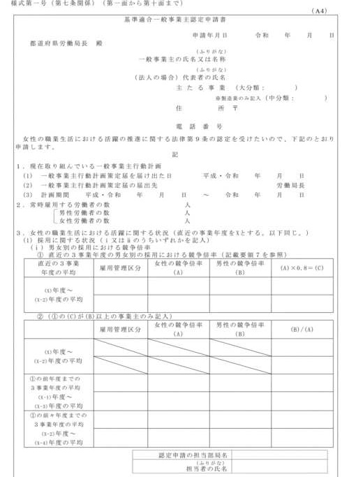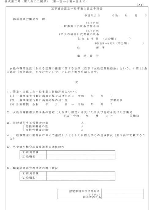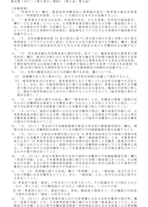 第九条の二 法第十二条の認定を受けようとする認定一般事業主(法第十条第一項に規定する認定一般事業主をいう。以下同じ。)は、基準適合認定一般事業主認定申請書(様式第二号)に、当該認定一般事業主が法第十二条の基準に適合するものであることを明らかにする書類を添えて、所轄都道府県労働局長に提出しなければならない。 |