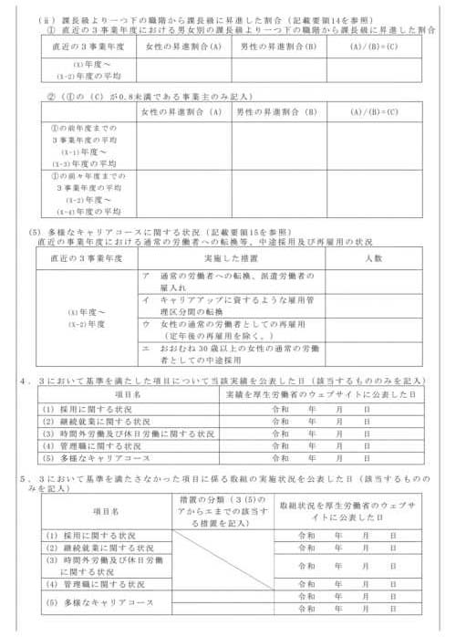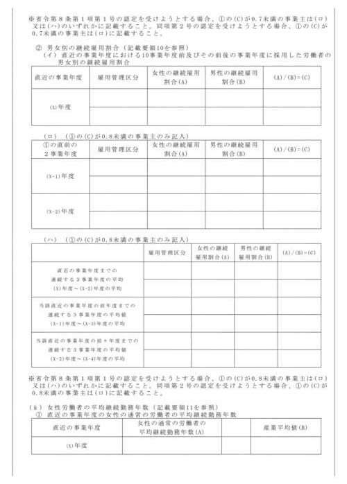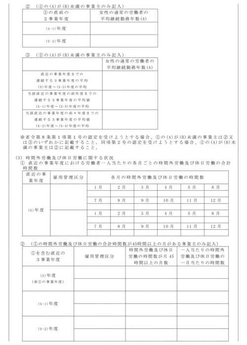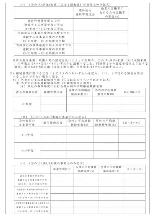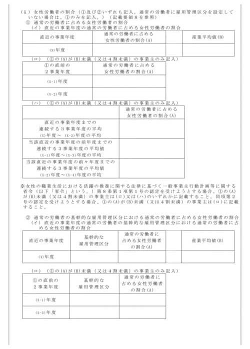 (2) イに掲げる事項のうち当該一般事業主が該当しない事項について、事業主行動計画策定指針に定められた当該事項に関する取組を実施し、その実施状況について厚生労働省のウェブサイトに公表するとともに、当該事項のうちイ(1)(ⅱ)、(2)、(3)又は(4)(ⅰ)に掲げる事項については、当該事項の実績について、次に掲げる(ⅰ)が(ⅱ)より改善し、かつ、(ⅱ)が(ⅲ)より改善しているとともに、イに掲げる事項のうち当該一般事業主が該当しない事項のうちイ(1)(ⅰ)、(4)(ⅱ)又は(5)に掲げる事項については、直近二年以上連続して当該事項の実績が改善していること。 |
