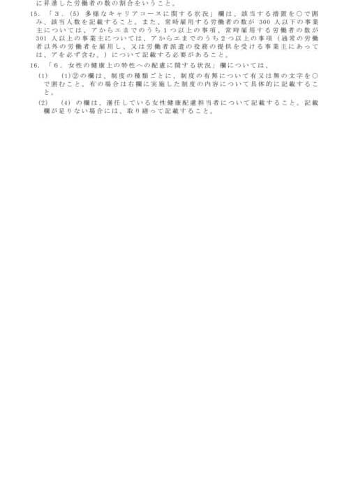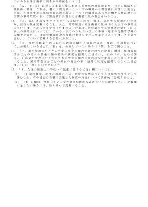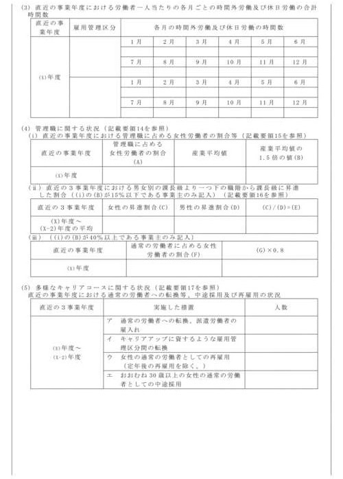第二条 法第八条第一項に規定する一般事業主(常時雇用する労働者の数が三百人を超えるものに限る。)が、一般事業主行動計画を定め、又は変更しようとするときは、直近の事業年度におけるその事業における女性の職業生活における活躍に関する状況に関し、第一号から第四号まで及び第二十四号に掲げる事項を把握するとともに、必要に応じて第五号から第二十三号までに掲げる事項を把握しなければならない。この場合において、第一号及び第二号に掲げる事項は、雇用管理区分(職種、資格、雇用形態、就業形態等の労働者の区分であって、当該区分に属している労働者について他の区分に属している労働者とは異なる雇用管理を行うことを予定して設定しているものをいう。以下同じ。)ごとの状況を、第二十四号に掲げる事項は、その雇用する全ての労働者に係る状況及び雇用管理区分ごとの状況を、それぞれ把握するとともに、必要に応じて第五号から第十二号まで、第十四号、第十五号、第十八号から第二十一号まで及び第二十三号に掲げる事項を把握するときは、雇用管理区分ごとの状況を把握しなければならない。 |