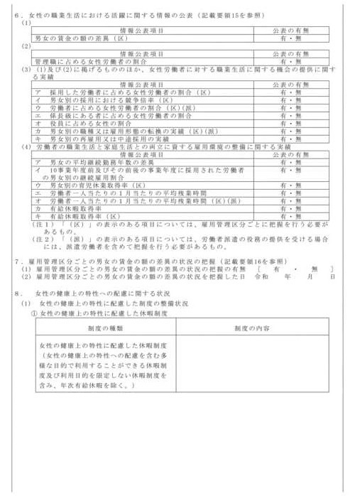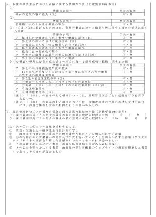 第二十条 法第二十条第二項の規定による情報の公表は、前条第一項第一号及び第二号に掲げる事項を公表するとともに、同項第三号及び第四号に掲げる情報の区分ごとに第三号及び第四号に定める事項のうち一般事業主が適切と認めるものを一以上公表しなければならない。 |