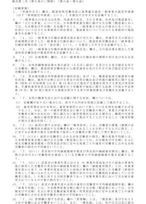 第九条の二 法第十二条の認定(以下「特例認定」という。)を受けようとする認定一般事業主(法第十条第一項に規定する認定一般事業主をいう。以下同じ。)は、基準適合認定一般事業主認定申請書(様式第二号。次条第一項第二号に規定する事業主の類型に係る特例認定を受けようとする者が、同項第一号に規定する事業主の類型に係る特例認定を受けた特例認定一般事業主であるときは、様式第二号の二 。)に、当該認定一般事業主が法第十二条の基準に適合するものであることを明らかにする書類を添えて、所轄都道府県労働局長に提出しなければならない。 |