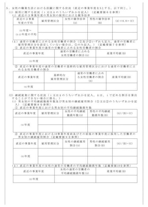 五 女性の応募者(募集に応じて労働者になろうとする者をいう。以下同じ。)の数を採用した女性労働者の数で除して得た数及び男性の応募者の数を採用した男性労働者の数で除して得た数(第十九条第一項第一号ロにおいて「男女別の採用における競争倍率」という。) |